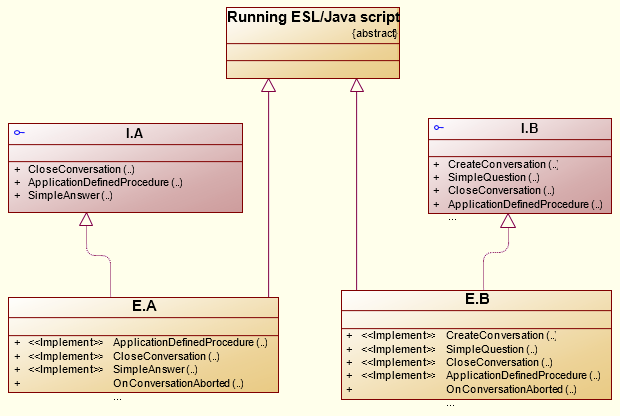 In order to handle the conversations, there are created the objects of ESL Interface type I.A and I.B, which implement the events E.A and E.B (usage of objects of ESL Interface type is not a condition).