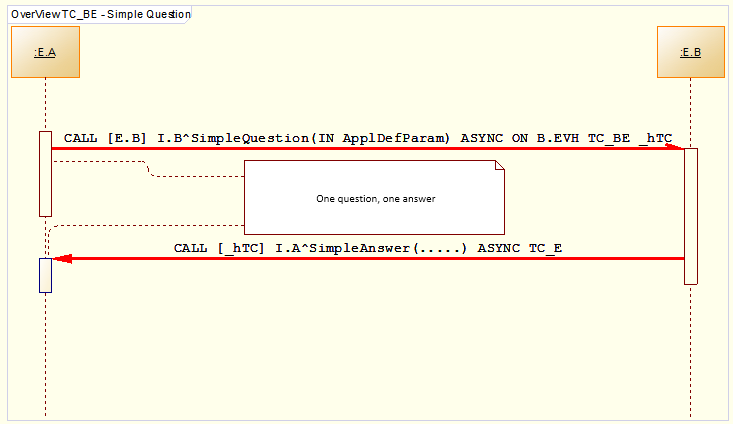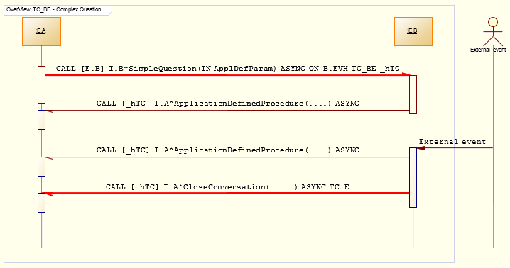 It is supposed that the conversation, which is created by calling CALL ... TC_B, will exist longer, or is necessary for changing a more complex sequence of messages. The conversation is created the way that some script initiates it in relation to other scripts. In the example below, the conversation is initiated by E.A in relation to E.B: