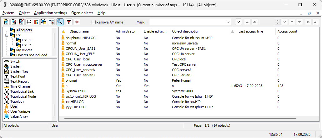 There are 2 basic types of D2000 users: administrators and standard users. Administrators can edit D2000 objects using D2000 CNF/D2000 GrEditor tools. Selected administrators can also edit/create other users. This is how to obtain the list of users in the D2000 Cnf tool: