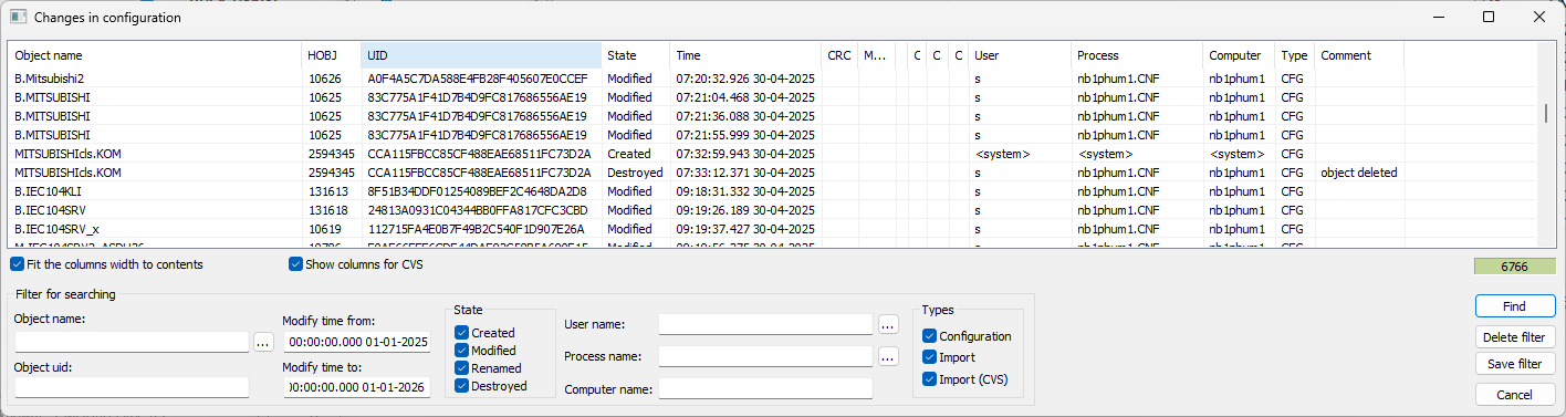 Also, “GIT object history” can be configured. In this mode, the D2000 system stores all changes (not only information about change, but XML export of changed objects| to an internal GIT repository, which can be viewed, used to compare individual versions, and, if needed, return to older versions.