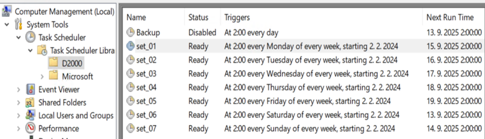 Backups of Syscfg/Logfile/Archive databases (from both redundant D2000 servers) are performed by the Sysprof Backup module. In the Sysprof schemes, backup parameters (start time, periodicity, timeout, and other parameters) are configured. Backups are performed on the management server where SYSPROF.EVH is running.