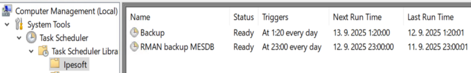 Backups of the MES database are configured as Windows scheduled tasks on the SrvDbs1v server. The MES database (Oracle application database) is backed up daily, using RMAN backup (to X:\Oracle\OraBack\MESDB) as well as the “exp” utility for export of individual schemes (to D:\_Backups\_LastNight). Exports are copied to \\SrvBkp1v\_Backup\LastNight\SRVDBS1 where the last backup is preserved.