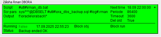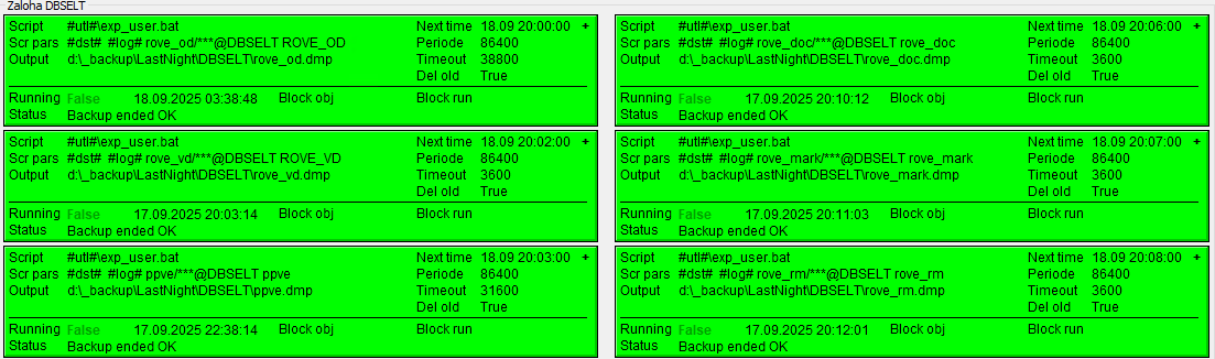 The Oracle "exp" utility is internally used to dump individual database schemes. The backups are then copied to the NAS server, with a 7-day retention (screenshot not included).
