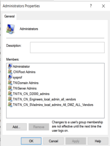 D2000 is part of the <Our_company> domain, and the domain is managed by the local IT department. We have read access to the active directory, where all the people from the control systems department are listed as local administrators (<list of names>). With these accounts, we can connect to the Windows servers with D2000. There is also a group for suppliers in the active directory, where every supplier who connects to the <Our_company> network has an account created. We can change these.