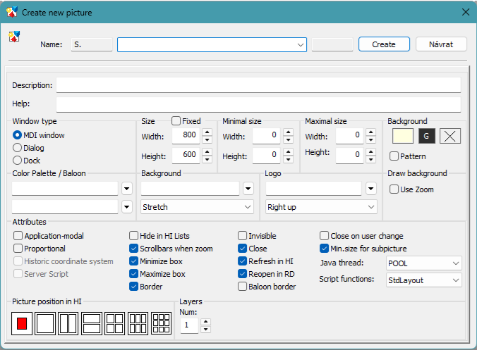 The parameters define a type of window containing the picture contents and its behaviour. The default setting is the MDI window on the desktop of the process D2000 HI.