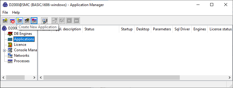 D2000 Application Manager (d2smc.exe) is used to configure the application on the Windows platform. After installing D2000, it can be started from the Windows menu or from a folder on the desktop.