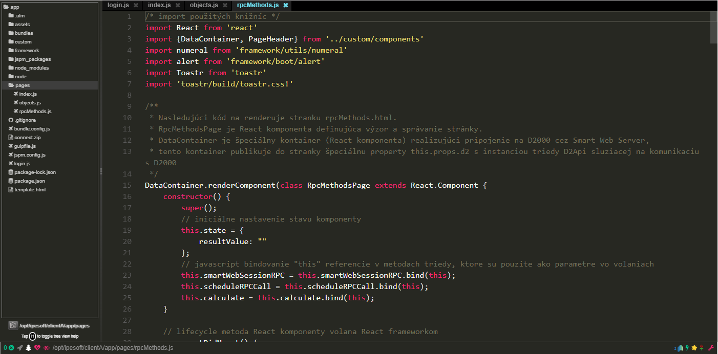 Creation and adjustment of source codes of a web application built on the Smart Web platform are possible also by using the web online editor Alm Tools that is implicitly available to the customer of the D2 Cloud service. How to use this online editor is described in the documentation on the page: https://alm-tools.gitbooks.io/alm/content/. Display of a panel with a tree of files and directories is realized with the shortcut Ctrl+ \.