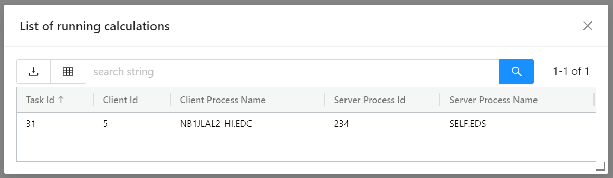 Connect to calculation – connection to running calculation which should be debugged. Dialog window displays the list of all running EDA calculations in the application with information such as on which EDA server the calculation runs, from which client was started, and the initiate vector that is calculated.