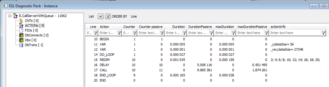 | Counter passive | The number of passive wait states. This value increases by 1 after each passive waiting on the action to carry out the activity which caused. The counter can be higher than the Counter. In the example above, the DELAY and RPC CALL SYNC action cause it (to reset it, use the option Reset counters). |