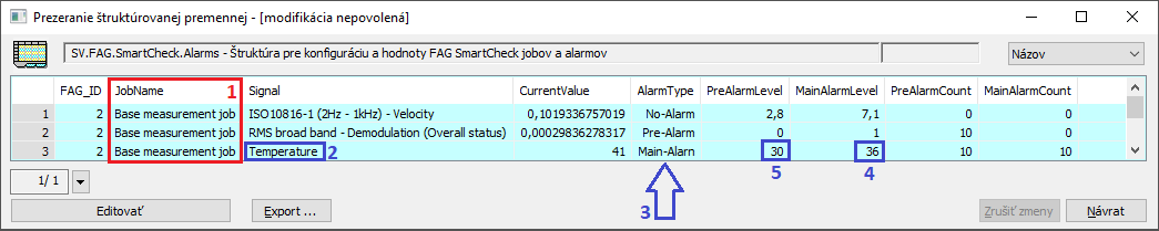 Using D2000, it is possible to watch alarm data of jobs with several signals configured via the web interface. For this purpose, the SV.FAG.SmartCheck.Alarms structure variable is intended. The meaning of each column is as follows: