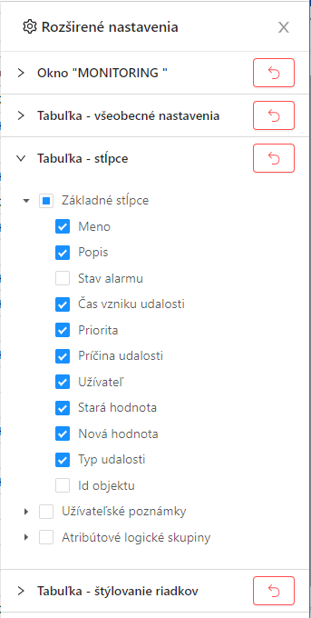The panel with advanced settings can be displayed via the menu from the button above the table. The panel appears on the right side of the screen and contains several expandable sub-panels.