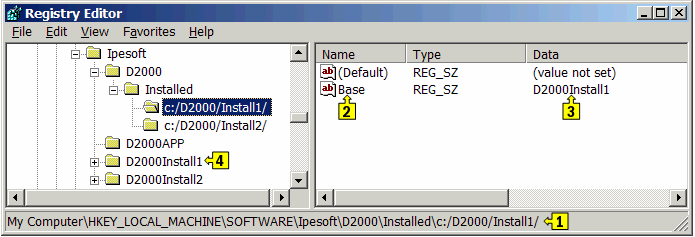 4. In the key HKEY_LOCAL_MACHINE\SOFTWARE\Ipesoft\D2000\Installed\c:/D2000/Install2/, create the string value Base and set up its value to D2000Install2.