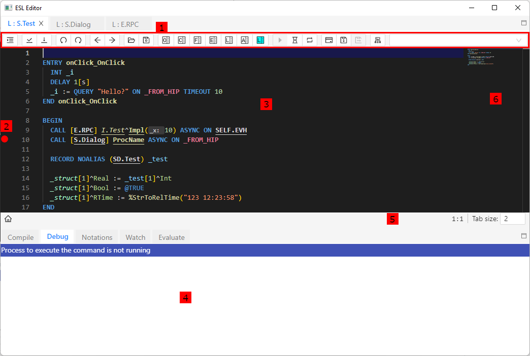 The figure below shows the ESL script editor window. Each script is opened in its own tab.
