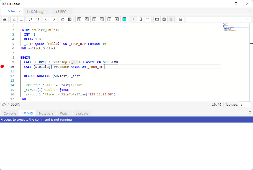 • Go to Definition - cursor is automatically moved to the declaration of the identifier. When using "Go to definition" on the remote procedure (RPC/PUBLIC), the ESL editor automatically opens the script, which contains the definition of procedure, and moves the cursor on the definition.