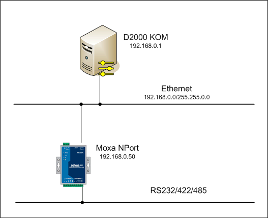 This is a simple connection of the NPort device which replaces an asynchronous serial port directly in the PC. No redundancy is used including NPort devices, D2000 System, and network interfaces.