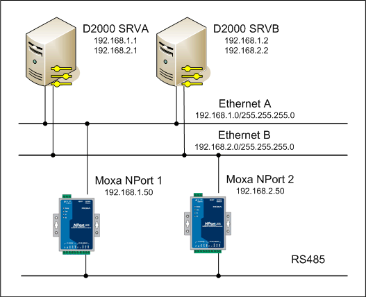 - D2000 Redundant System consists of two servers SRVA and SRVB connected to both Ethernet networks with addresses: