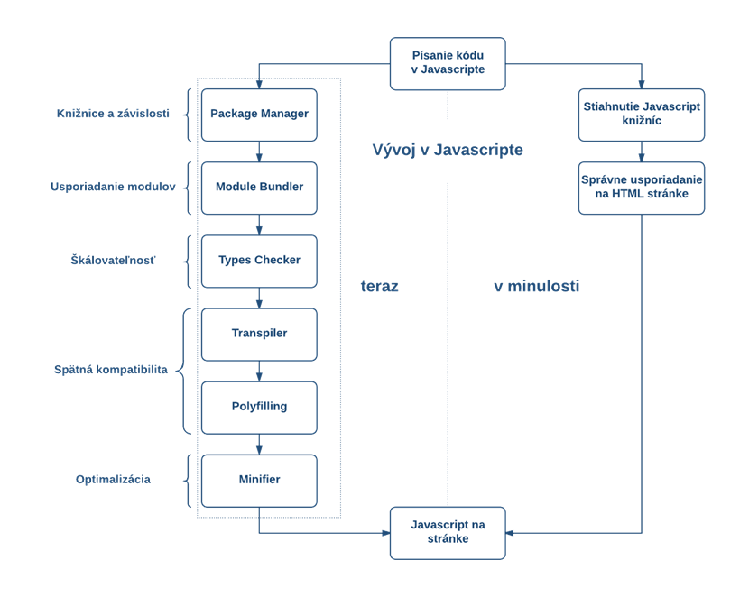 Development of Javascript applications has changed dramatically over the past years. The reason is mainly that the code capacity on web sites has expanded exponentially and Javascript itself has gone through major changes as a language. While in the past, it was enough to manually add own code or download library to a web site, this method is not practical when using modern applications nowadays. Reasons are the following: