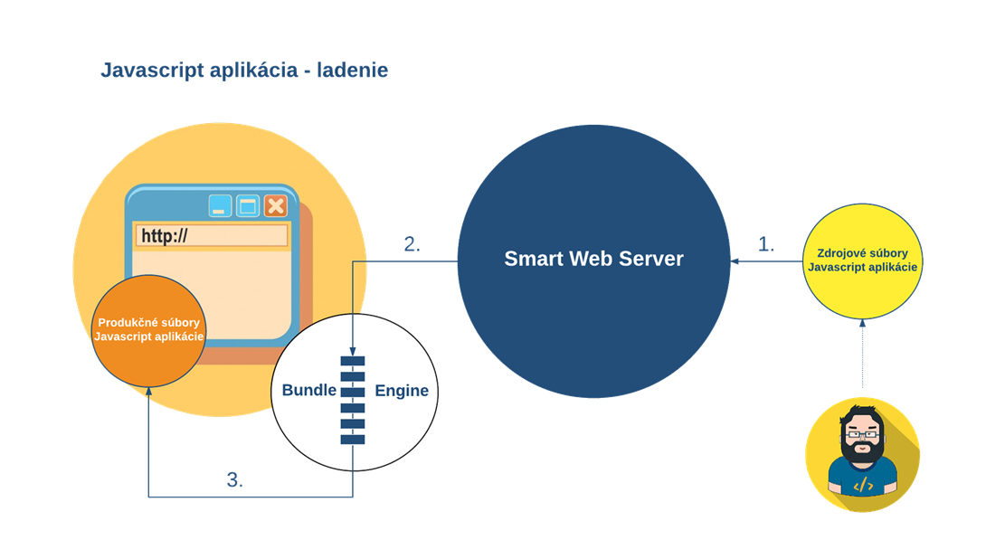 Since every tool used for transformation of source codes to productive in the Bundle Engine are implemented in Javascript, it is possible to execute this transformation also directly in the browser schematically displayed on the following picture. This way of running the application site is advantageous for debugging directly in a browser when we also have source code at disposal.