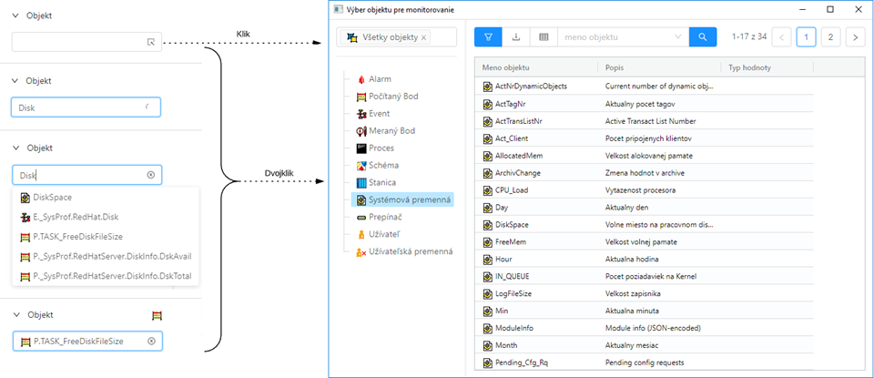 If the user needs to search for an object, it is possible to open a separate selection window with a table by clicking on the icon on the right side of the selection box or by double-clicking.