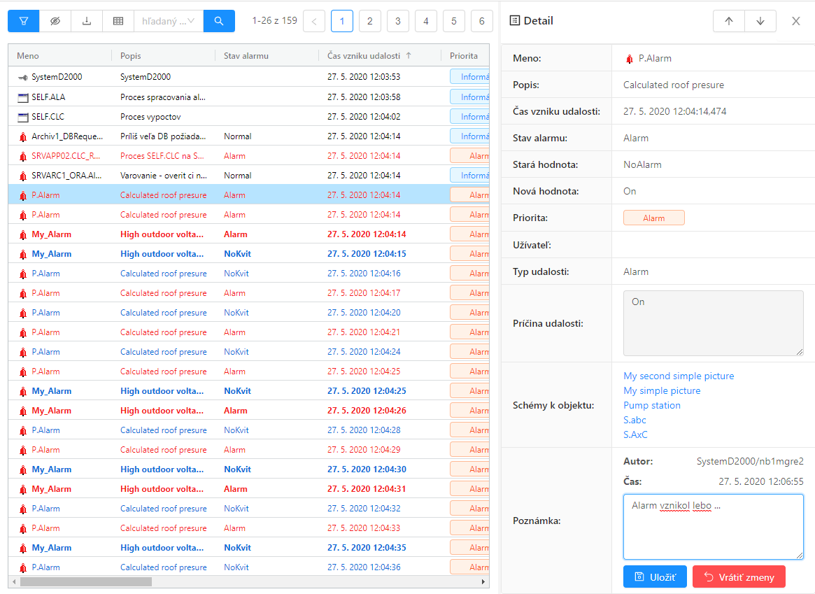 In addition to the list of schemes, the user is able to enter a note on the monitored event (note item in the image below), which can describe the details of the event in more detail. The username, as well as the time of the last modification, is saved in the database with the text field of the note after pressing the Save button at the end of the panel.