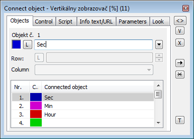 Each vertical/horizontal percentage displayer can display the values of as many as 12 objects. The tab Objects contains input edit boxes allowing to define 12 objects. To define objects to display in the displayer either enter their names or select them from a list opened after clicking the button placed right from the input box.