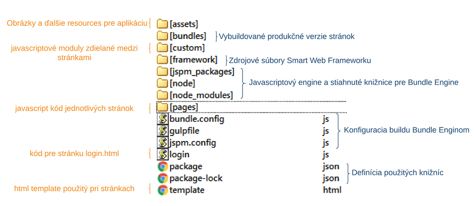 On the right, there are described files generated or copied by the SmartWeb Bundle Engine. Those are mostly built production versions of pages, files of the SmartWeb framework and the JavaScript engine with downloaded libraries for the bundle engine.