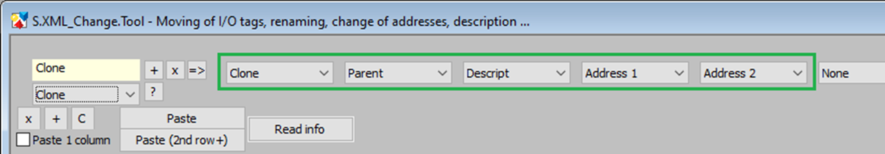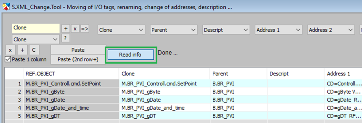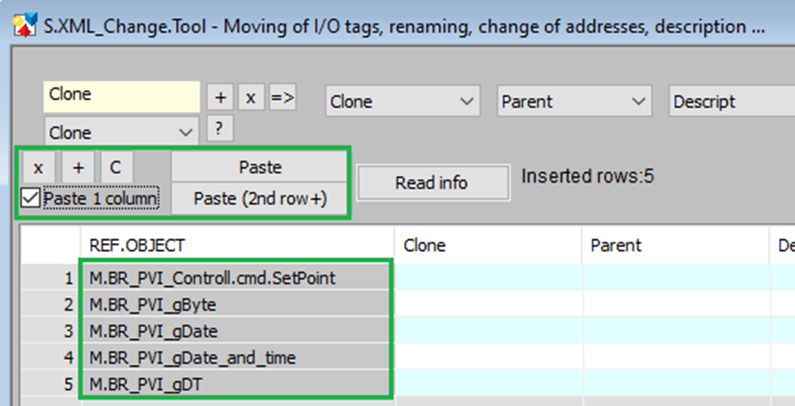 Now we can set new object parameters. For example, when cloning I/O tags, it is necessary to change the name (Clone column) and it is also possible to change the parent (Parent column) and possibly the addresses. Changes can be made by manual editing, marking the relevant column and pasting from the clipboard ("Paste" button), or using the Search & Replace section.
