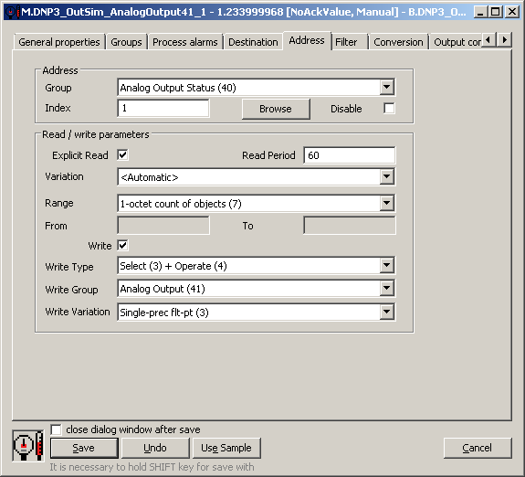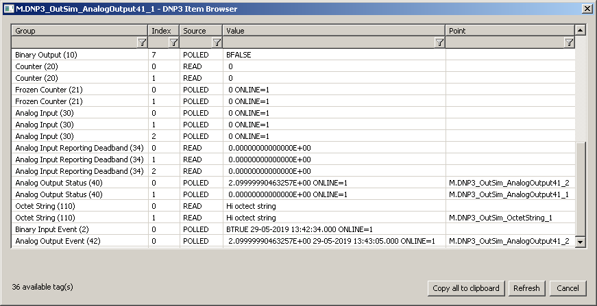 - ak sa jedná o "udalostnú" skupinu objektov a o skupinu objektov konfigurovateľnú v meraných bodoch, ktoré sú mapované do toho istého meraného bodu (na obrázku Analog Output Status (40) a Analog Output Event (42), oba s Index=0, meraný bod M.DNP3_OutSim_AnalogOutput41_2).
