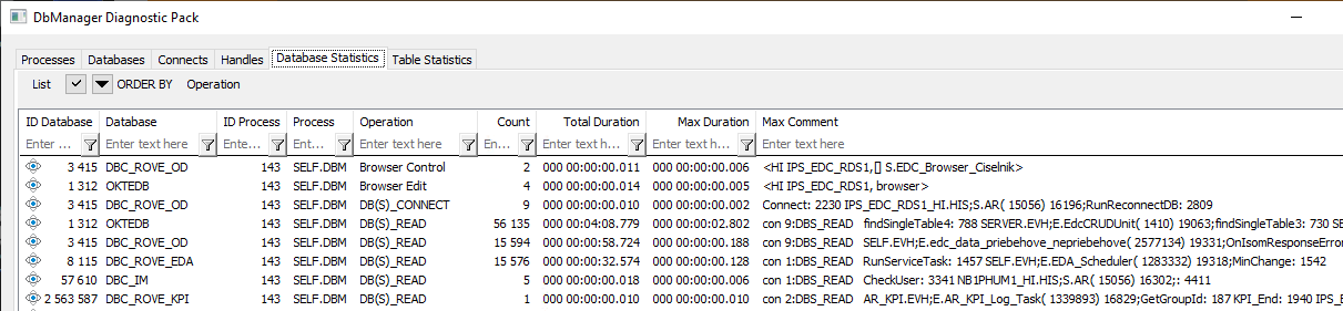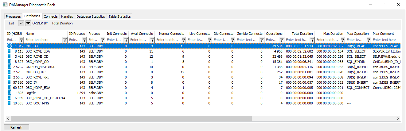 | Total Duration | Celkové trvanie operácií konkrétneho typu vykonaných na objekte Databáza procesom DbManager (od štartu alebo od posledného resetu štatistík). |