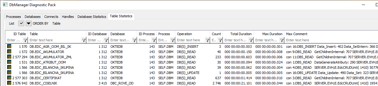 | Total Duration | Celkové trvanie operácií konkrétneho typu vykonaných na objekte Tabuľka procesom DbManager (od štartu alebo od posledného resetu štatistík). |
