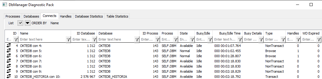 | Handles | Počty handlov v rámci spojenia. Handle vznikajú akciami DB_CONNECT, PG_CONNECT, SQL_CONNECT, akciou DB_TRANS_OPEN a v transakčnom režime každou databázovou akciou až do volania DB_TRANS_COMMIT alebo DB_TRANS_ROLLBACK. |