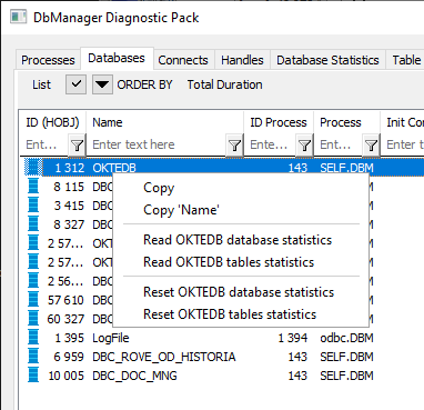 - Reset statistics - all tables: štatistiky o o objektoch typu Tabuľka na vybranom DBM procese budú vyčistené (nezvratne).