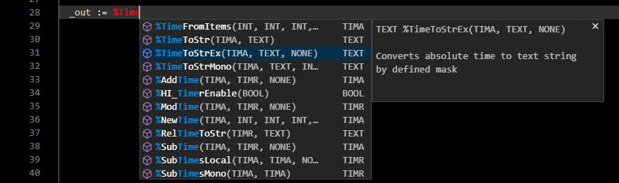 - Ak je pred kurzorom text začínajúci "%", sú navrhované funkcie, pričom zoznam s návrhmi je filtrovaný na základe textu za "%"
