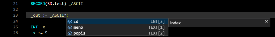 - Za menom objektu typu Štruktúrovaná premenná alebo menom lokálnej premennej typu RECORD sa po zápise znaku '^' zobrazí zoznam stĺpcov štruktúry s číslom stĺpca a jeho popisom. Názvy stĺpcov v zozname sú abecedne zoradené.