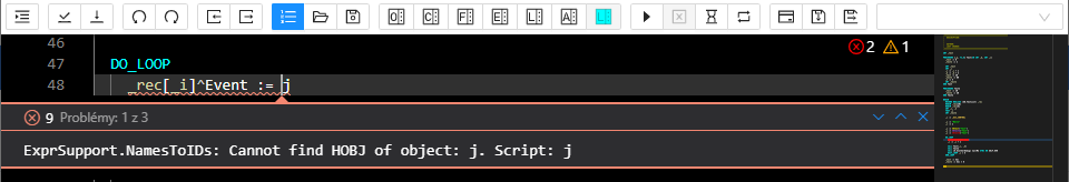 - Po neúspešnej Kontrole syntaxe alebo Kompilácii, dvojitým stlačením myši v zozname chýb (obrázok oblasť 5) sa kurzor presunie na výskyt chyby. Ďalšou možnosťou ako sa navigovať medzi chybami alebo upozorneniami je pomocou klikania myšou na ikonu/y v pravom hornom rohu editora, ktorá sa zobrazí v prípade chyby/upozornenia. Po kliknutí sa presunie pozícia okna na danú chybu aj s popisom chyby, každé ďalšie kliknutie na ikonu presunie pozíciu okna na ďalšiu chybu/upozornenie v poradí.