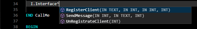 - Po zadaní znaku "^" za názvom interface sa zobrazí zoznam procedúr, ktoré sú pre daný interface definované. Po vybratí položky zo zoznamu sa definícia procedúry doplní do ESL Editora.