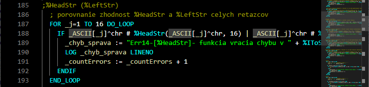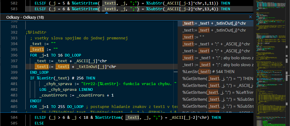 - Rýchla navigácia v skripte pomocou minimapy (obrys kódu). Pre rýchle presúvanie v skripte je možné kliknutím a ťahaním šedej časti v minimape presúvať aktuálne zobrazenú časť skriptu v editore. Minimapa obsahuje zvýraznené časti kódu ako je riadok s pozíciou kurzora, v prípade neúspešnej kontrole syntaxe alebo kompilácii sú tu červenou farbou zvýraznené riadky s chybou alebo oranžovou farbou riadky s upozornením. Po umiestnení kurzora v editore na lokálnu premennú alebo procedúru, sú pod posuvníkom zobrazené sivou farbou všetky výskyty danej premennej/procedúry v rámci skriptu.