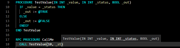 - Automatické zobrazovanie parametrov funkcie po zadaní názvu funkcie a prvej zátvorky. Akutálne zadávaný parameter je podčiarknutý a zvýraznený. Ponuku s popisom parametrov funkcie je možné zobraziť aj po umiestnení kurzora v editore medzi parametre funkcie a stlačení klávesovej skratky CTRL+SHIFT+SPACE