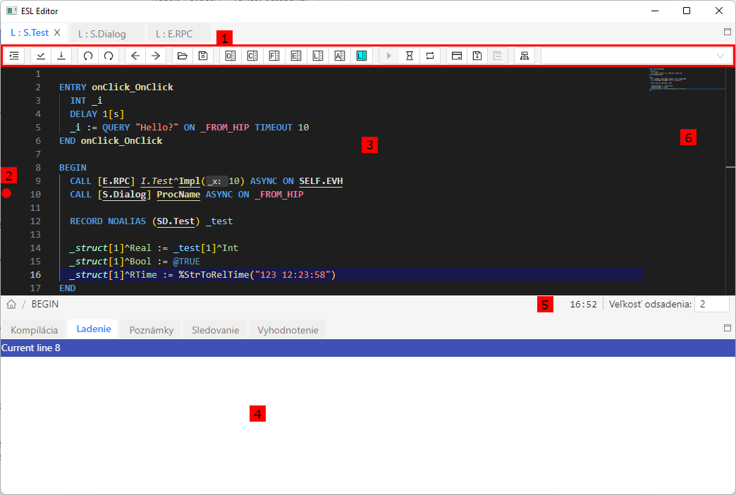 Obrázok znázorňuje členenie pracovnej plochy editora skriptov. Pre každý novo otvorený skript sa automaticky vytvorí nová záložka.