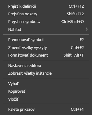 - Paleta príkazov (CTRL+F1) - zobrazí všetky dostupné akcie v editore