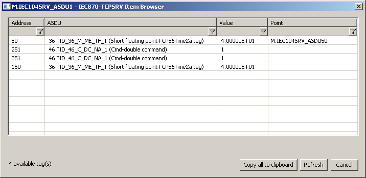 Po kliknutí na tlačidlo Browse sa otvorí okno IEC870-TCPSRV Item Browser a zobrazí sa zoznam doteraz načítaných hodnôt. Zoznam objektov sa vytvára dynamicky v dôsledku prijatých správ .