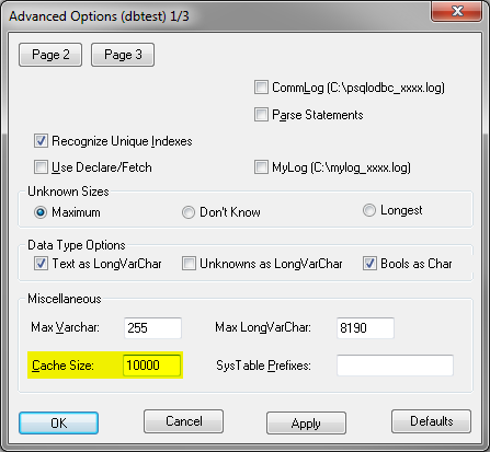 Pre optimálny výkon sa odporúča v rozšírených nastaveniach dátového zdroja (DSN) zvýšiť veľkosť cache na 10000: