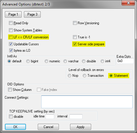 Na ďalšej stránke rozšírených nastavení DSN je pre správne fungovanie EDA potrebné vypnúť konverziu koncov riadkov (LF <-> CR/LF conversion), nastaviť Level of rollback on errors na Statement a zapnúť Server side prepare: