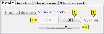 Vykonaj sa - Vykonať sa v okne nenachádza. Stlačením tlačidla ON alebo OFF sa vykoná povel na nastavenie hodnoty a súčasne i flagov (príznakov) hodnoty výstupného objektu.