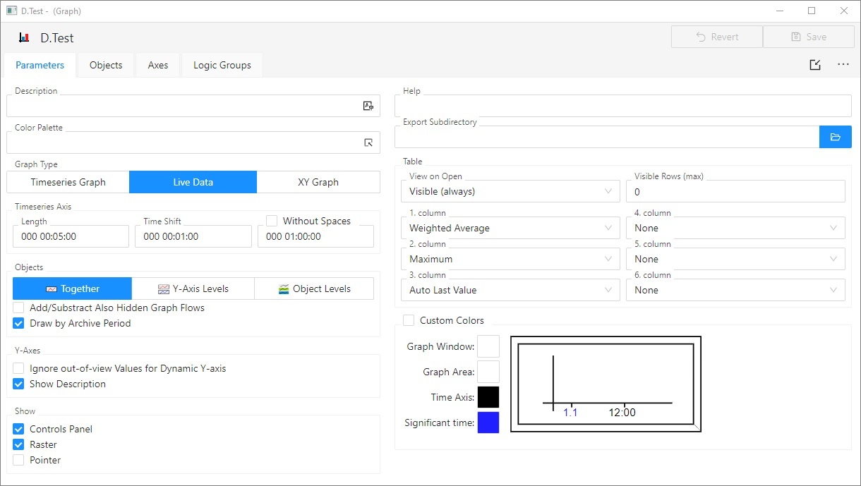 Time shift | The parameter Time shift relates to a time length. It sets a periodic beginning of time axis. If time shifts is e.g. 1 hour then time axis will begin with whole hour. The parameter is enabled, if the parameter Live data is checked. |