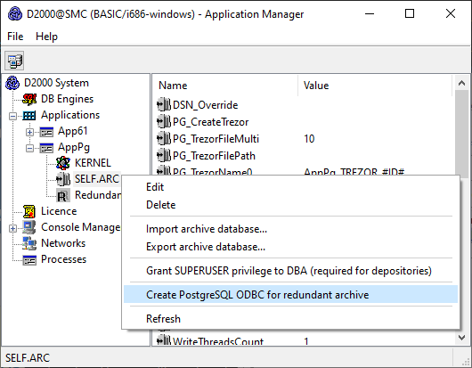 Poznámka: na vytvorenie DSN vzdialenej archívnej databázy sa pre PostgreSQL dá použiť nástroj D2SMC. V kontextovom menu na položke konkrétneho archívu (štandardne SELF.ARC ) treba vybrať "Create PostgreSQL ODBC for redundant archive".