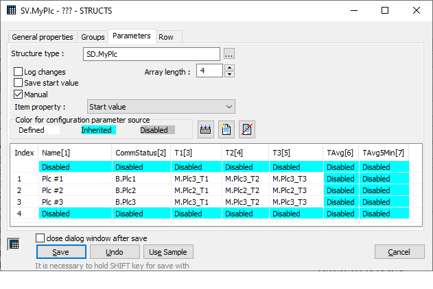 Ak chceme, aby štruktúrovaná premenná nebola konštantná (aby sa do jednotlivých položiek dalo zapisovať), zaškrtneme Manual. Ak chceme nastaviť možnosť zápisu iba pre jednotlivé stĺpce alebo položky, vieme predefinovať Manual na úrovni stĺpca (v záhlaví) alebo až na jednotlivé položky. To isté platí aj o ďalších vlastnostiach nakonfigurovaných pre jednotlivé stĺpce v definícii štruktúry (limity, ukladanie štartovacej hodnoty, hysterézia, textová paleta, index do transformačnej palety).
