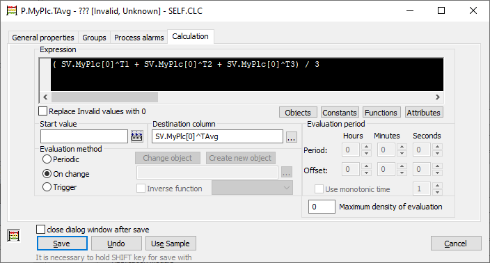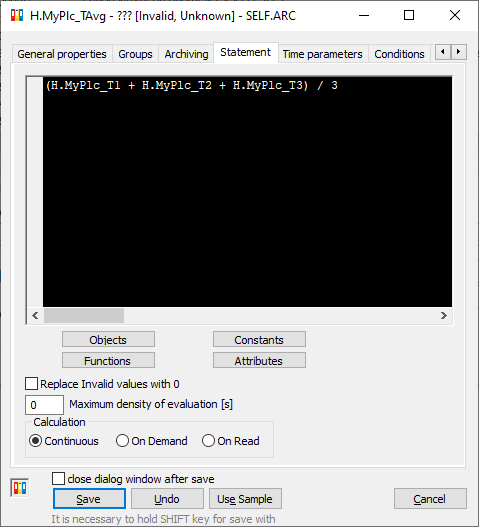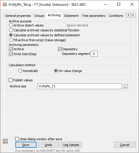 Ďalším krokom je vytvorenie vypočítaného štruktúrovaného archívu, ktorý bude počítať priemer teplôt. Vytvoríme archivovanú hodnotu s názvom H.MyPlc_TAvg, nastavíme Účel archívu na Prepočet zaarchivovaných hodnôt zadaným výrazom.