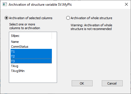 Keď máme v D2000 Cnf označenú štruktúrovanú premennú a klikneme na ikonu "Do archívu", môžeme si vybrať stĺpce, ktoré chceme archivovať. Neodporúčame archivovať celú štruktúru naraz.