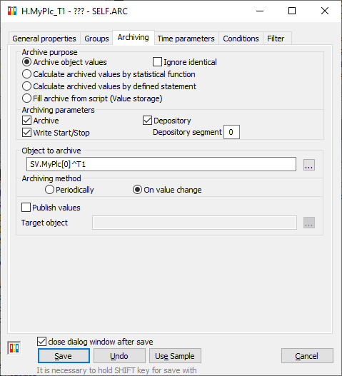 Nastavíme Rozmer archívu na ľubovolný z troch zdrojových archívov, napr. H.MyPlc_T1 (je možné pre rozmer použiť aj položku štruktúrovanej premennej, napr. SV.MyPlc[0]^TAvg, v tomto prípade by bolo možné zaškrtnúť aj Zverejňovať hodnoty a vypočítané priemery by sa zverejňovali v zadanom stĺpci (takže by sme nepotrebovali ani vyššie vytvorený štruktúrovaný počítaný bod P.MyPlc.TAvg).